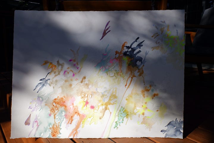 We had been talking about the ever changing nature of color. We think color is static, but it’s not. In fact it is also always changing in small ways, both apparent and disarming to our eyes. And so I was tracing a lot of shadows, that shimmer in the wind and twinkle as our eyes observe their constant movement. I woke up and traced a Nootka rose bush in front of my cabin. Over that past month, I’ve painted in more of the outline with earth and lake pigments I’ve made and bursts of neon synthetics (from Case for Making). I let the paint bloom and drip, creating their own little tributaries. At some point, it’ll feel complete. And then I’ll start on another big piece of paper, maybe feeling less stress (or not). I’ll keep painting.